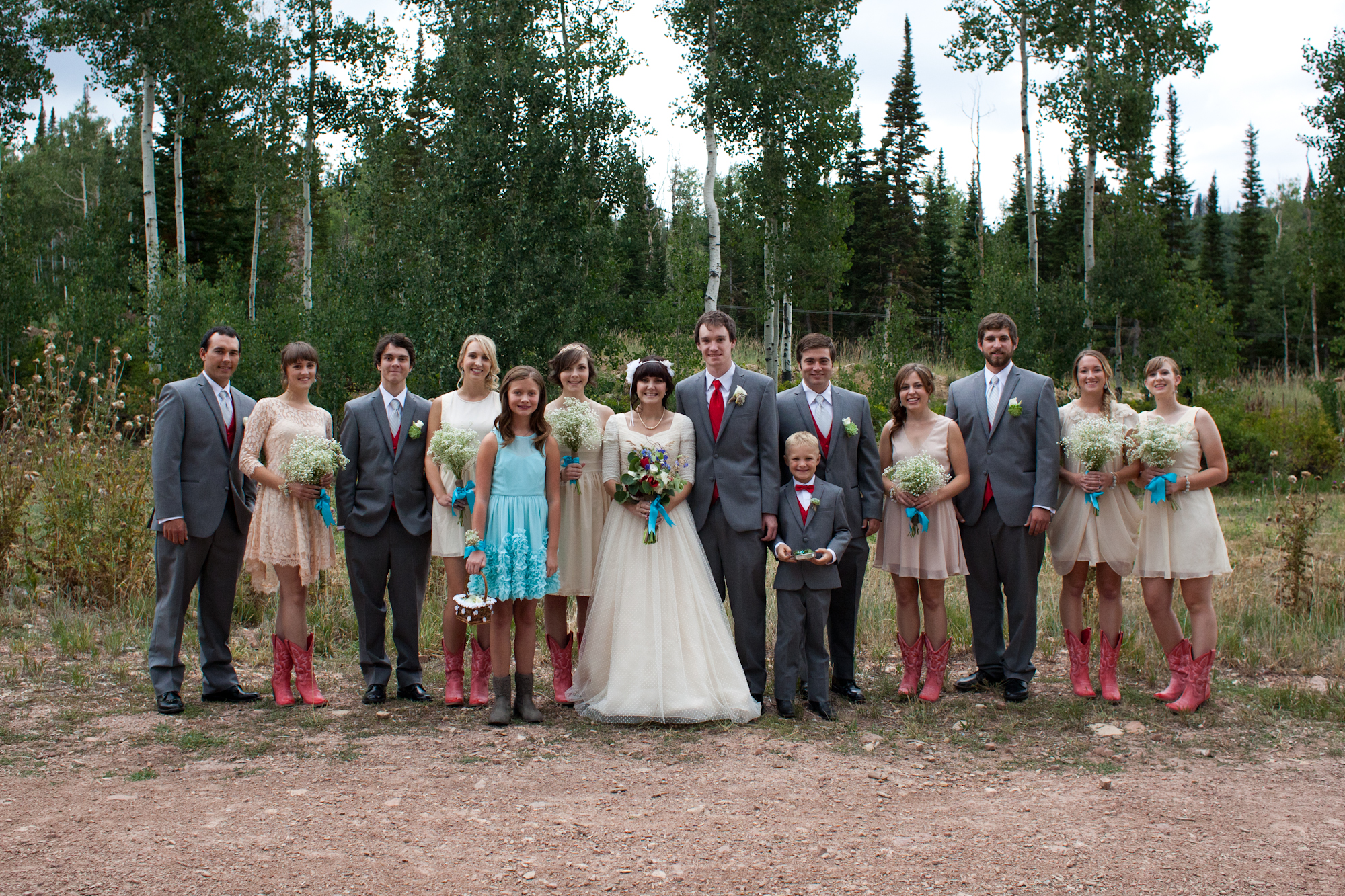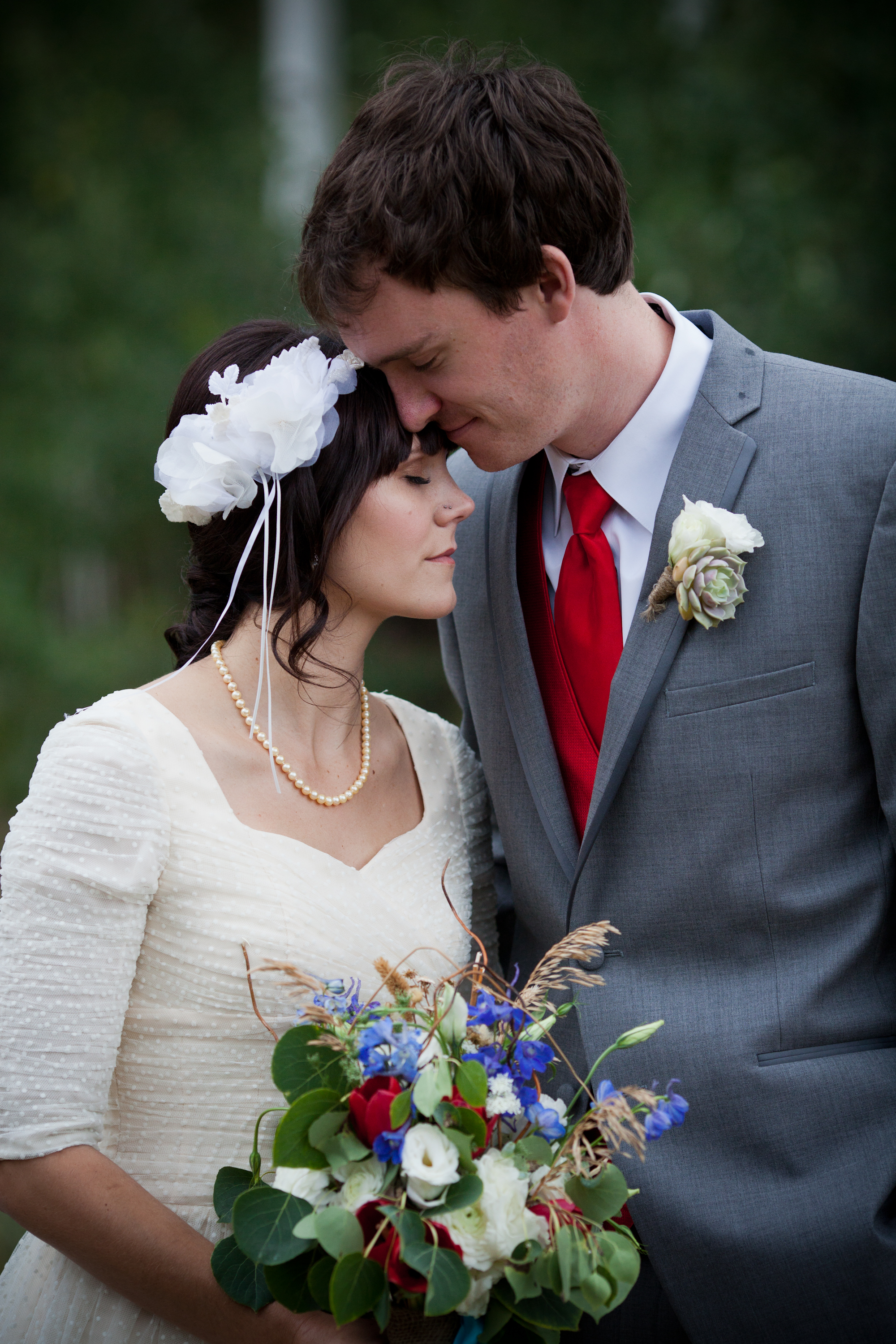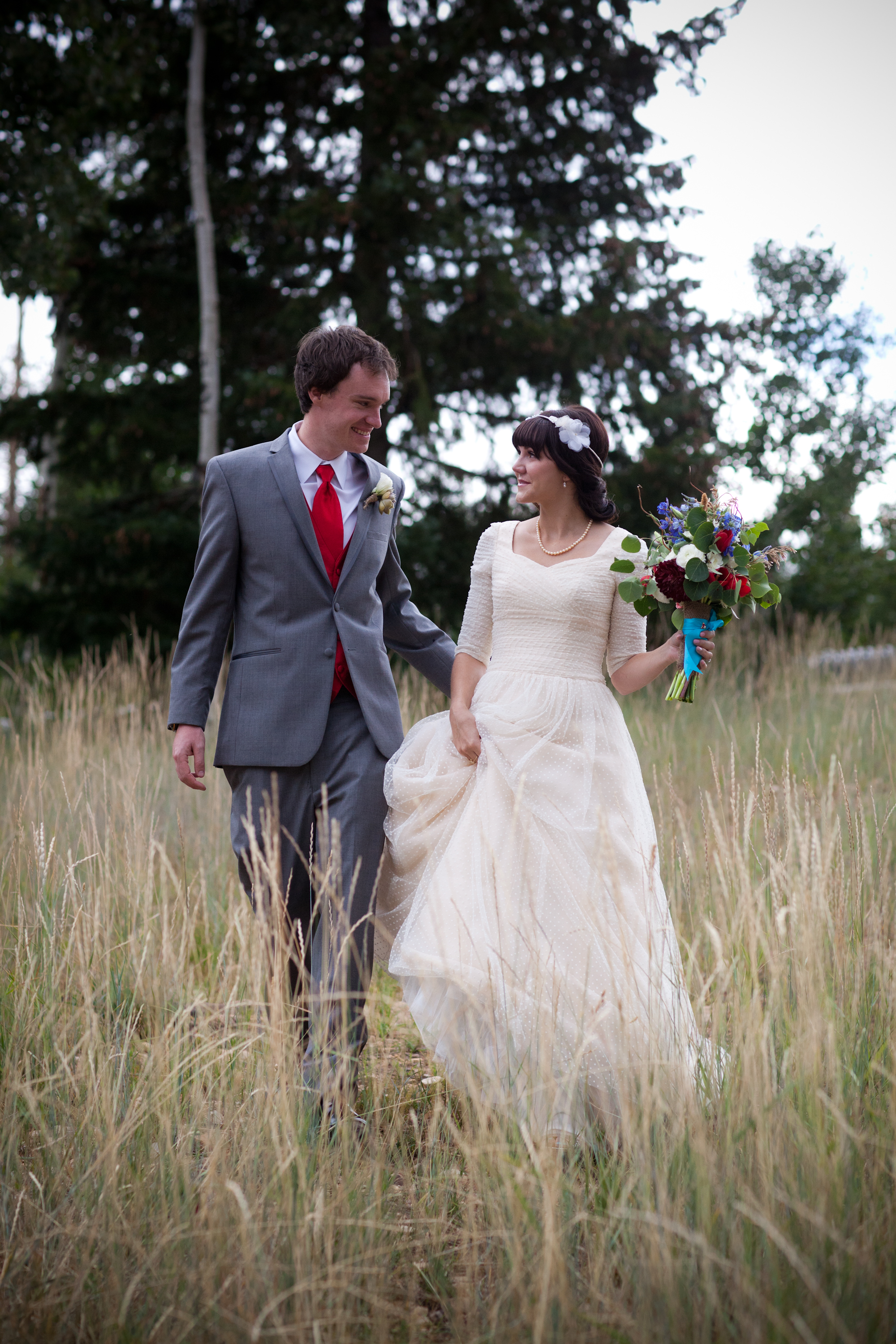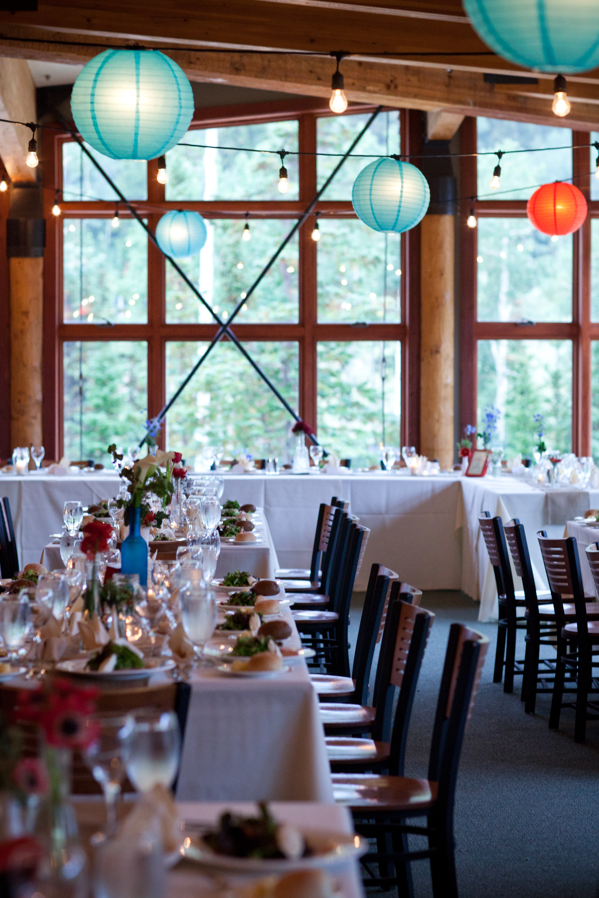 Turquoise and red were the colors for this natural and vintage inspired wedding in the mountains. A severe thunder storm didn’t stop guests from getting up to the venue via gondola chair lift and partying into the wee hours of the morning. The rainy day only added to the ambiance; the reception tent oozed with romance as the paper lantern and bistro-lit ceiling illuminated the night. Cheers to this adorable couple!