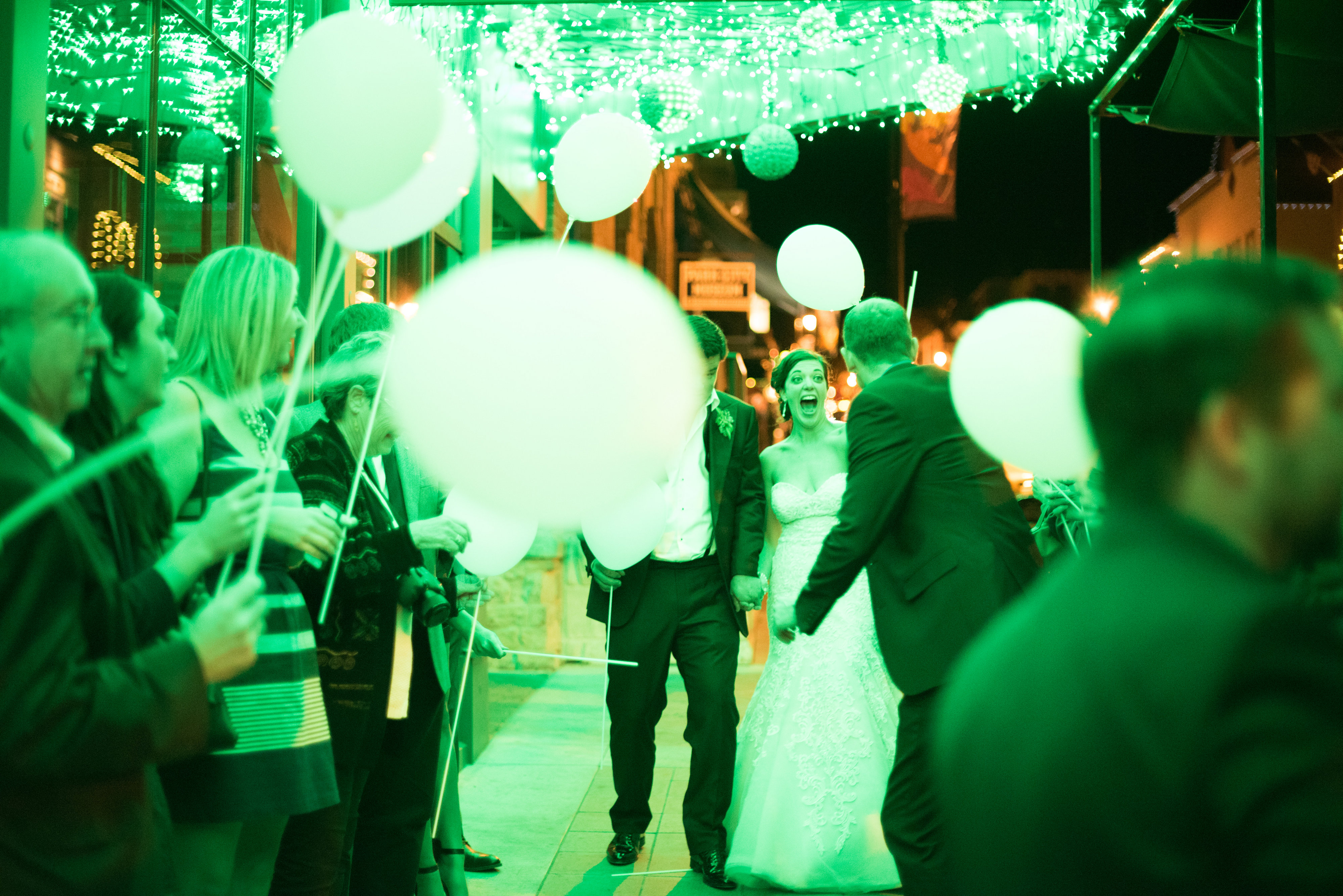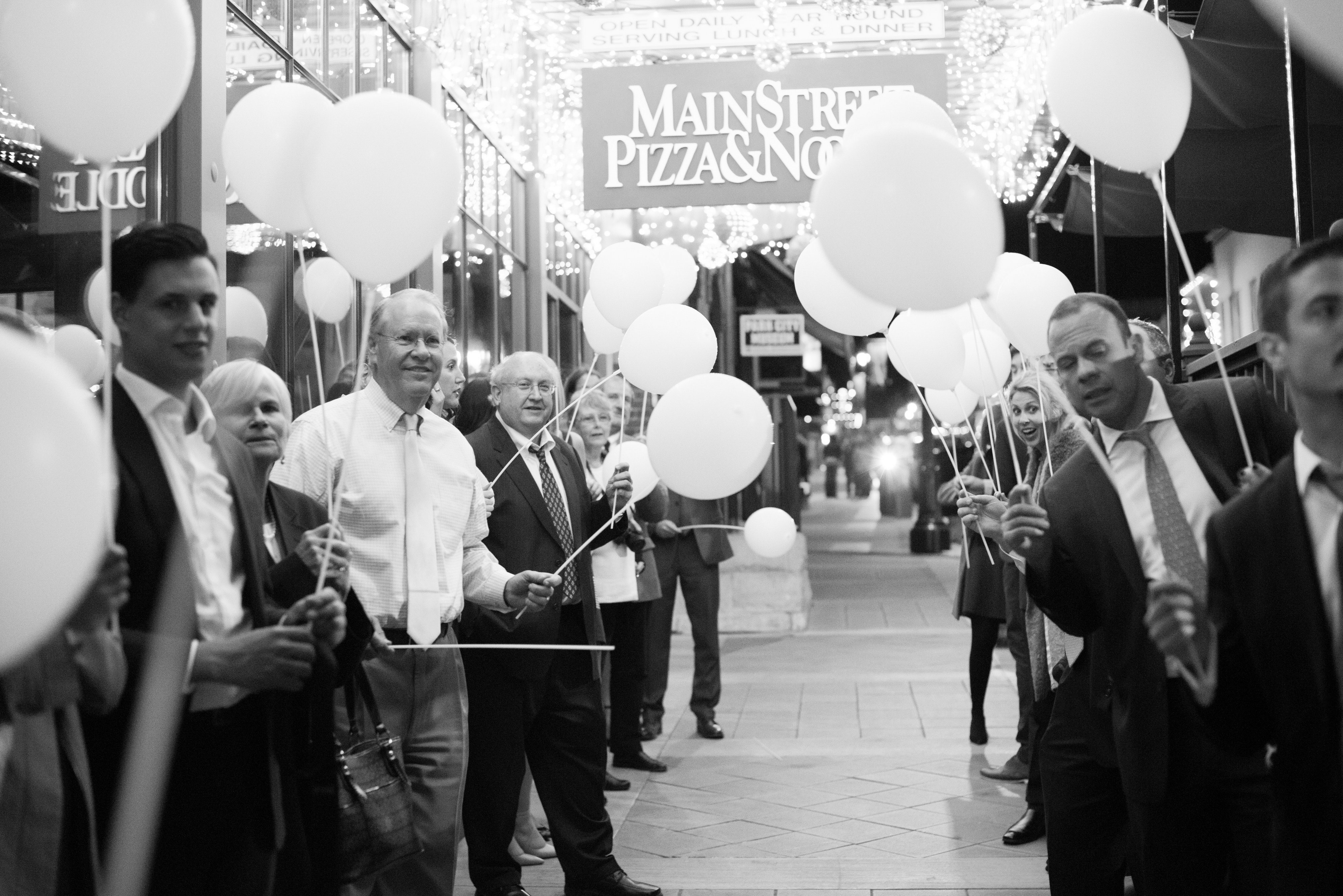 The night concluded with a balloon-lit sendoff. Guests lined the sidewalks of Main Street with their LED filled white balloons and made a tunnel for the couple. One of the not-so-glamorous moments behind the scenes was picking up 75-100 bits of popped latex balloons that lined the street at the end of the night. But worth every achy bend of that tired Wedding Planner’s body; that sendoff was spectacular! Cheers to this fabulous couple!