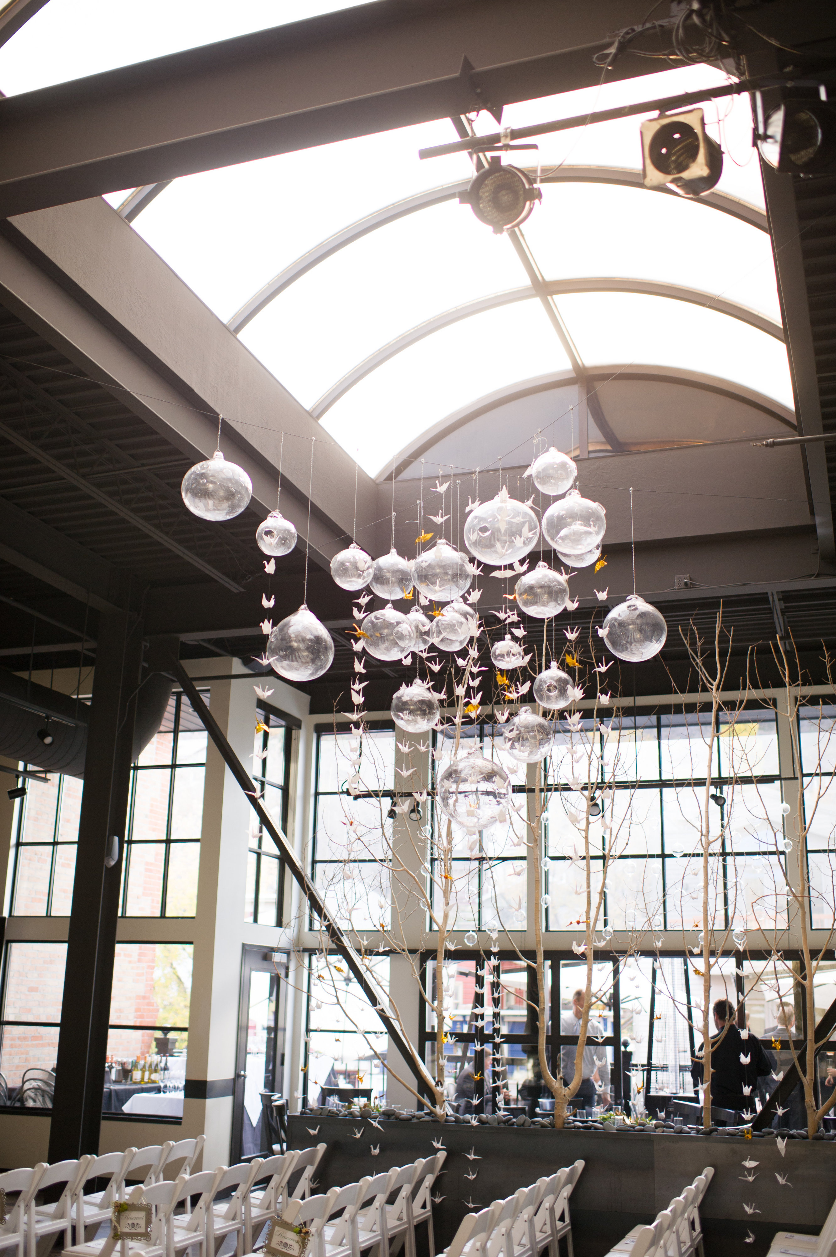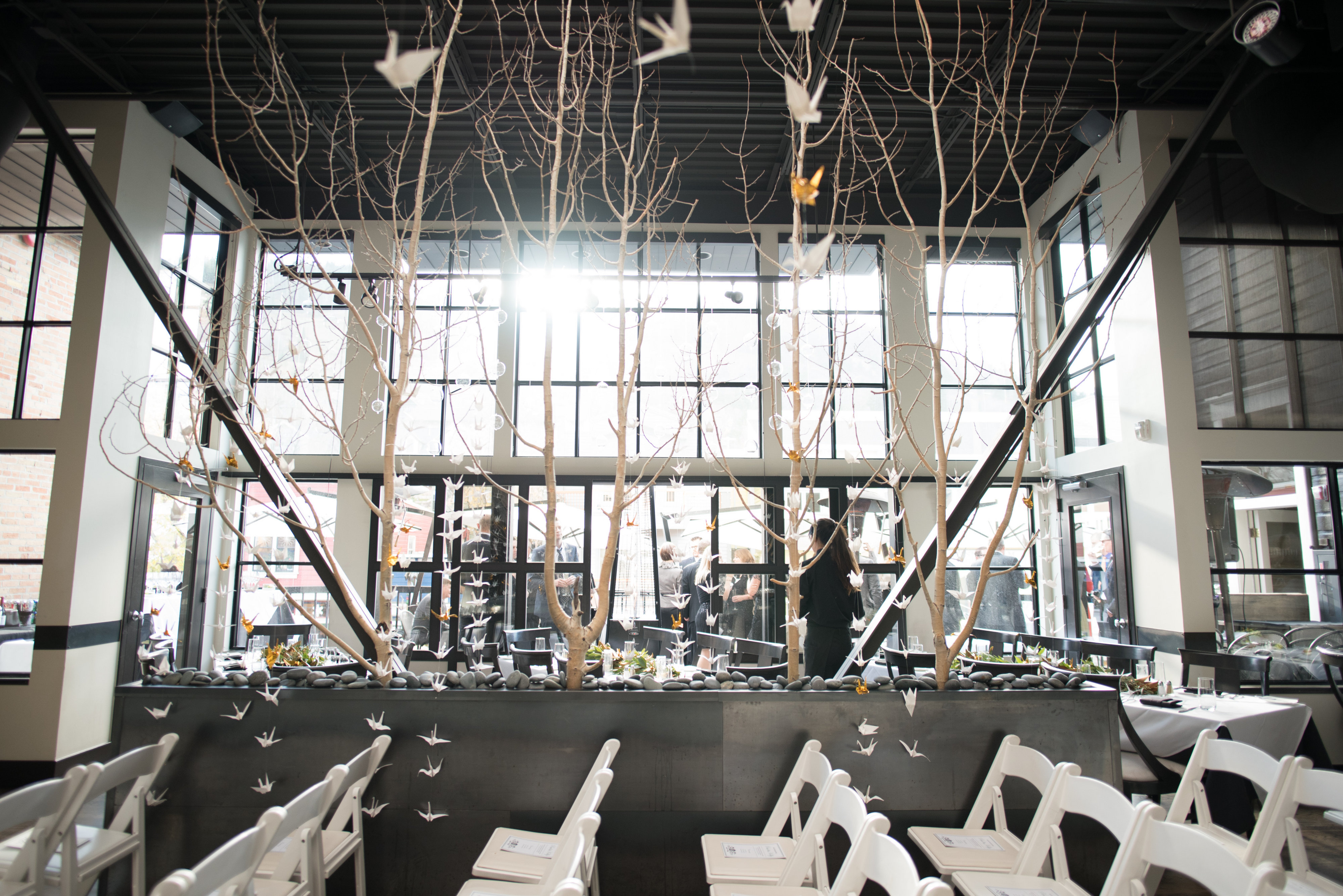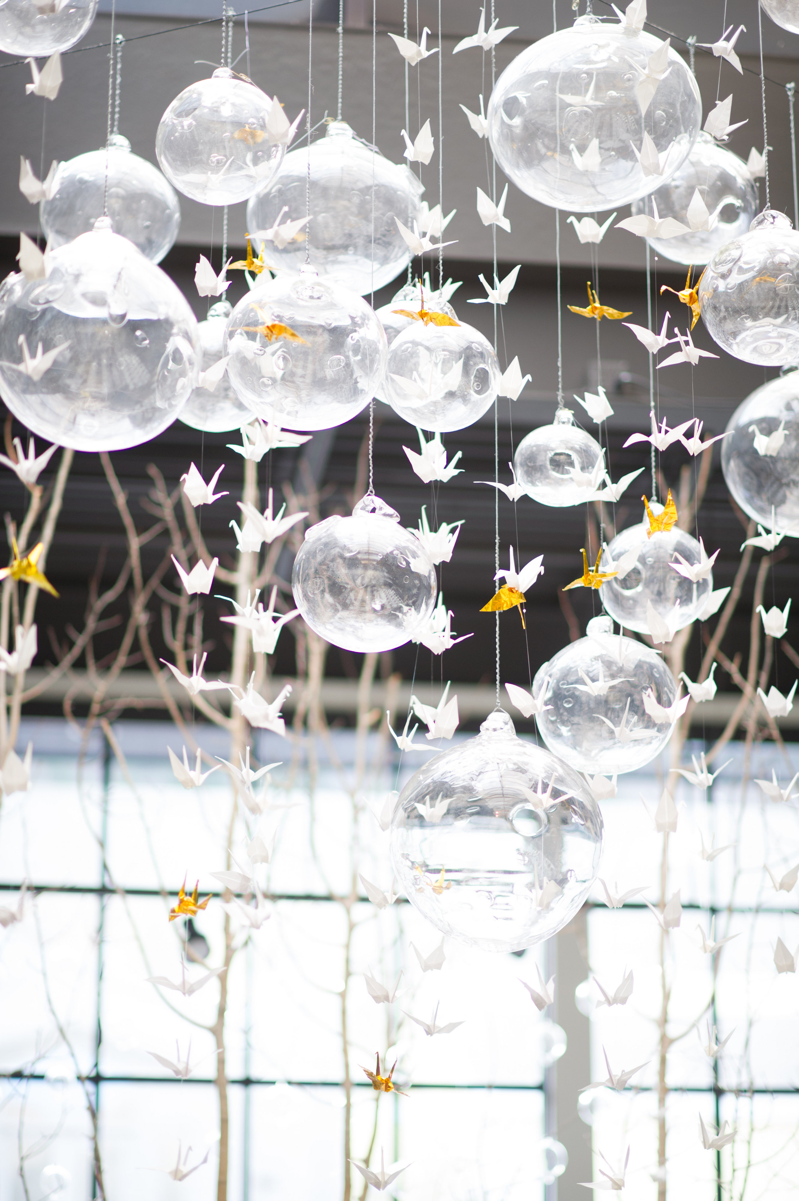 We hung 1,000 paper cranes, the traditional symbol of love in Japan, throughout the space. The elegant bird mates for life and is a popular motif in weddings. Japanese lore holds that the crane is one of three holy creatures that can live for 1,000 years. Thus, couples fold 1,000 origami paper cranes, one for each year of the crane’s life, enabling the “bird of happiness” to carry the couple’s prayers to heaven. The majestic cranes were also used as the couple’s escort cards, showing guests to their tables.