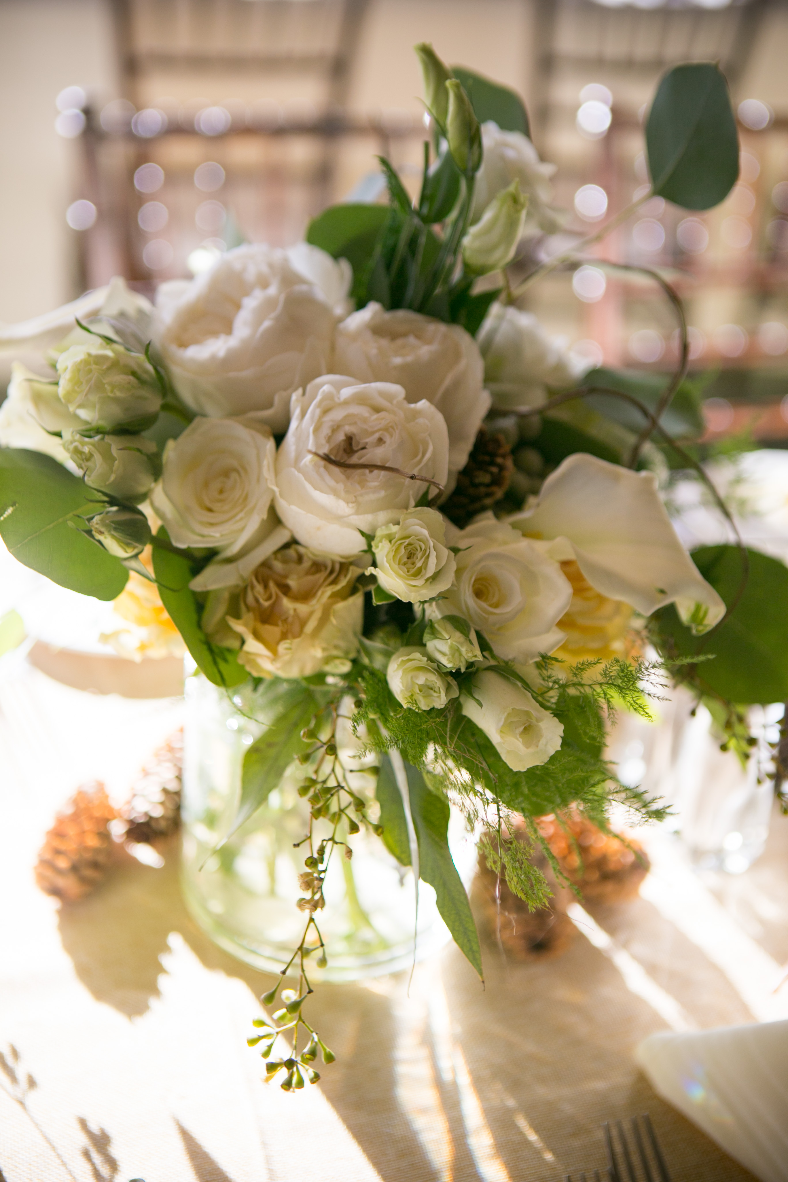 My favorite touches were the starlit twinkle trees that we used to disguise an unsightly curtain, as well as their rustic and romantic table decorations. We combined antlers, twigs, aspen candles, succulents, and a plethora of romantically lush flowers on each table to bring it all together.